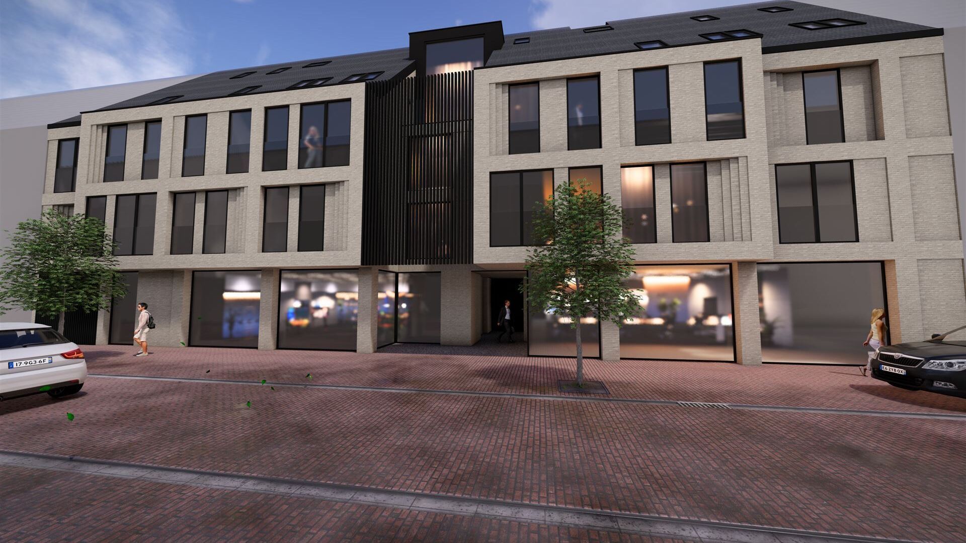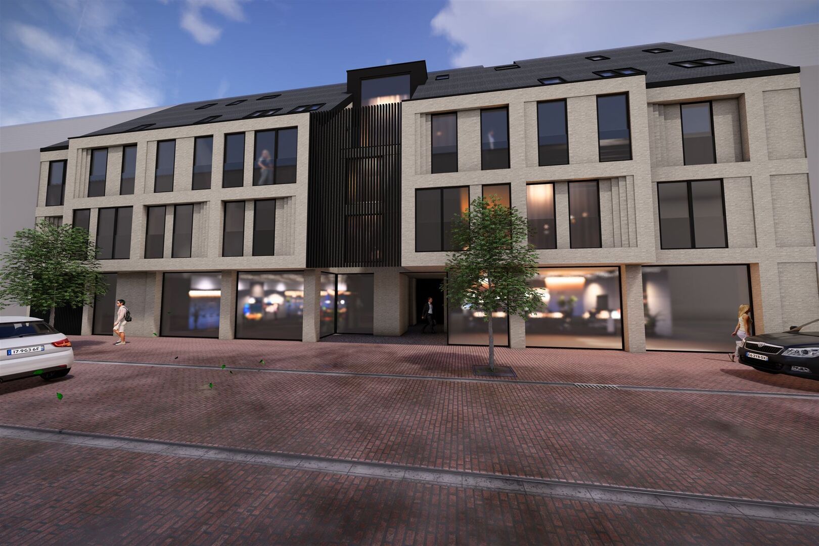 Er zijn 2 handelspanden en 650 m² gemeenschappelijke tuin op het gelijkvloers. Verdieping 1 en 2 bieden ieder 4 appartementen en op verdieping 3 zijn 2 duplexen. Verder zijn er 27 autostaanplaatsen en 11 bergings ondergronds.